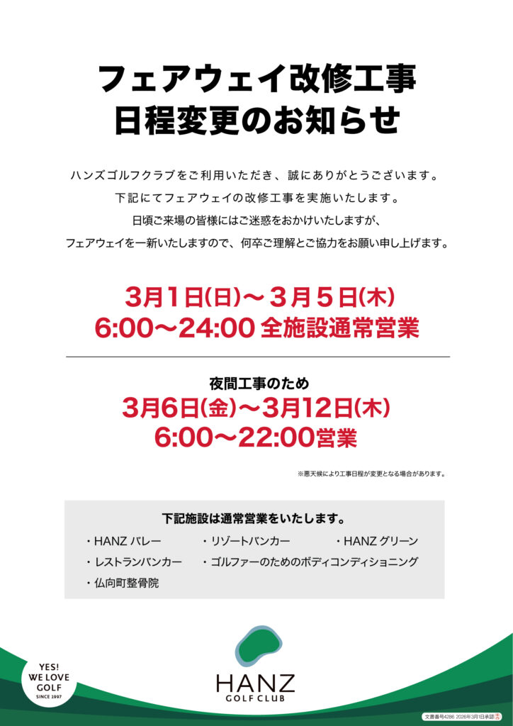 フェアウェイ改修工事 2/23-2/28 終日クローズ 3/1-3/6 6:00-22:00営業